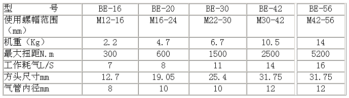 BK42氣扳機進入風扳機的壓縮空氣應清潔無污,并含有一定的潤滑油。氣管內(nèi)徑應不小于規(guī)定尺寸,并不得過長,以免進入風扳機的氣壓過低,風扳機的正常工作氣壓為0.5Mpa,進入風扳機的氣壓不宜過高,否則易造成過載使機件使用壽命縮短。使用結(jié)束后用木塞堵上進氣口,以免污物進入機內(nèi)。