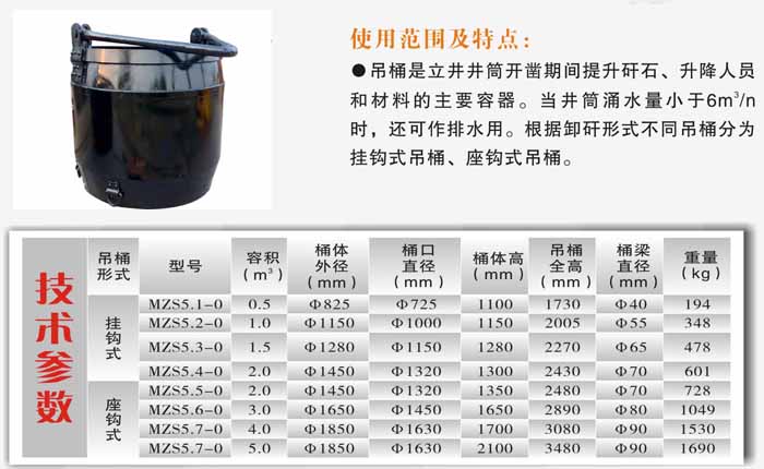 - 吊桶,根據(jù)卸矸形式不同那,可分為掛鉤式吊桶和座鉤式吊桶。而吊桶是立井井筒開(kāi)鑿期間提升矸石,升降人員和材料的主要容器。并且,當(dāng)井筒涌水量小于/h時(shí),還可作排水用。非常方便,簡(jiǎn)單易操作。使用范圍及特點(diǎn):吊桶是立井井筒開(kāi)鑿期間提升矸石、升降人員和材料的主要容器。當(dāng)井筒涌水量小于6M3/h時(shí),還可作排水用。根據(jù)卸矸形式不同吊桶分為掛。鉤式吊桶、座鉤式吊桶座鉤式吊桶的用途:吊桶是立井井筒開(kāi)鑿期間提升矸 石、升降人員和材料的主要容器。當(dāng)井筒涌水量小于6M3/h時(shí),還可作排水用。座鉤式吊桶是礦山立井施工中用于運(yùn)送混凝土的專用設(shè)備,它適用于煤礦、金屬礦、非金屬礦及其他立井施工需要澆注混凝土的場(chǎng)合。座鉤式吊桶特別對(duì)用凍結(jié)施工深表土層時(shí)、不能使用輸料管下料時(shí),更適合,座鉤式吊桶是煤礦鑿井期間安全生產(chǎn)必不可少的。舊式底卸式吊桶在使用過(guò)程中顯得笨拙,操作不方便,卸料不完全等缺點(diǎn)。本產(chǎn)品在原有的技術(shù)上改革創(chuàng)新,擺脫了這些缺點(diǎn),提高了輸送混凝土的速度,操作簡(jiǎn)便,在出料口的弧行板面設(shè)有橡膠板,保證了出料口部的密封性和漿液不泄露,同時(shí)也延長(zhǎng)了吊桶的使用壽命,對(duì)避免和防止在煤礦立井期間不安全的隱患發(fā)生有著十分重要的意義,因此將該項(xiàng)技術(shù)推廠應(yīng)用,順應(yīng)煤礦安全生產(chǎn)和發(fā)展的趨勢(shì)和需求。結(jié)構(gòu) 兩種型式的吊桶的結(jié)構(gòu)均如下圖所示,不同的是掛鉤式吊桶是平底,座鉤式吊桶如下圖右下角所示是雙層桶底結(jié)構(gòu)。另外,3m3以下型號(hào)桶梁無(wú)圖示之支撐。座鉤式吊桶輸送混凝土的優(yōu)點(diǎn)是:1、卸料快,操作簡(jiǎn)便。2、安全可靠。3混凝土的水灰比能得以充分保證。比用管道輸送的優(yōu)點(diǎn)是無(wú)離析現(xiàn)象。4、在完成一個(gè)段高的砌壁工作后,工作面清理工作量小,從而砌壁速度快。5、矸石吊桶在翻轉(zhuǎn)卸料時(shí)對(duì)吊盤沖擊大,底卸式吊桶則無(wú)此弊端,且不須在吊盤上設(shè)專人司摘掛鉤工作,因而能節(jié)省人時(shí)。6、能適應(yīng)各種砌壁工藝。座鉤式吊桶需要配鉤頭裝置使用,礦用吊桶是立井井筒開(kāi)鑿期間提升矸石、升降人員和材料的主要容器。座鉤式吊桶應(yīng)用要求1. 使用前應(yīng)檢查銷軸的螺母及開(kāi)口銷是否松動(dòng)損壞脫落、銷軸桶梁轉(zhuǎn)動(dòng)處是否銹蝕、轉(zhuǎn)動(dòng)是否靈活,有缺件及時(shí)更換。使用時(shí)各轉(zhuǎn)動(dòng)處應(yīng)加油潤(rùn)滑,避免零件之間的干磨損。2.座鉤式吊桶桶體上的四個(gè)鉤環(huán),主要供提升時(shí)穩(wěn)定、移動(dòng)及更換吊桶時(shí)操作之用。3. 桶梁掛鉤處磨損量達(dá)到下列情況時(shí),建議更換: ⑴ 容積4m³以上(含4m³)吊桶桶梁磨損量小于垂直方向設(shè)計(jì)直徑10mm時(shí);⑵ 3m³以下(含3m³)的吊桶桶梁磨損量小于垂直方向設(shè)計(jì)直徑12%時(shí)。4. 使用期間應(yīng)有專人對(duì)桶梁、銷軸、耳環(huán)、鉚釘、焊縫進(jìn)行檢查。5.座鉤式吊桶適用于自動(dòng)翻矸裝置。座鉤式吊桶的桶底是雙層桶底,桶底中間有中心圓孔,是為自動(dòng)翻矸時(shí)與鉤子配合所用,吊桶規(guī)格不同,雙層桶底中心孔幾何尺寸也不同,使用時(shí)只需參照吊桶圖樣式對(duì)自動(dòng)翻矸裝置的托架寬度與支撐高度加以修改即可。掛鉤式吊桶無(wú)雙層桶底,適用于人工掛鉤翻矸.6. 為防止桶梁砸手,應(yīng)在桶梁落腳的桶口處焊上四個(gè)桶梁支撐板塊。座鉤式吊桶保養(yǎng)、維修用戶應(yīng)定期檢查桶梁耳柄、內(nèi)外耳環(huán)板孔壁、桶梁掛鉤段圓弧、銷軸軸頸等處的潤(rùn)滑及磨損情況,經(jīng)常處于干摩擦狀態(tài)時(shí)會(huì)加劇磨損,當(dāng)磨損量達(dá)到第五條中的相關(guān)規(guī)定時(shí),建議更換。當(dāng)桶體壁凹凸不平嚴(yán)重、彎曲變形、銹蝕嚴(yán)重、桶壁減薄、局部焊縫開(kāi)裂,應(yīng)進(jìn)行檢修再用。貯存半年以上,使用前進(jìn)行檢查、保養(yǎng)。