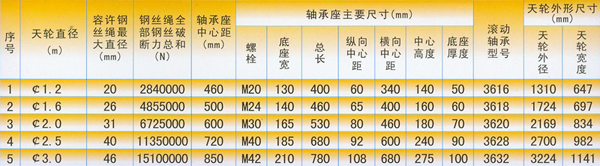 3)提升天輪采用繩輪與軸承座可調(diào)型式,使用時(shí)根據(jù)實(shí)際情況進(jìn)行選用,還可根據(jù)情況,另行組合設(shè)計(jì),可不受規(guī)定品種和可調(diào)型式的限制,但訂貨時(shí)應(yīng)加以說(shuō)明。