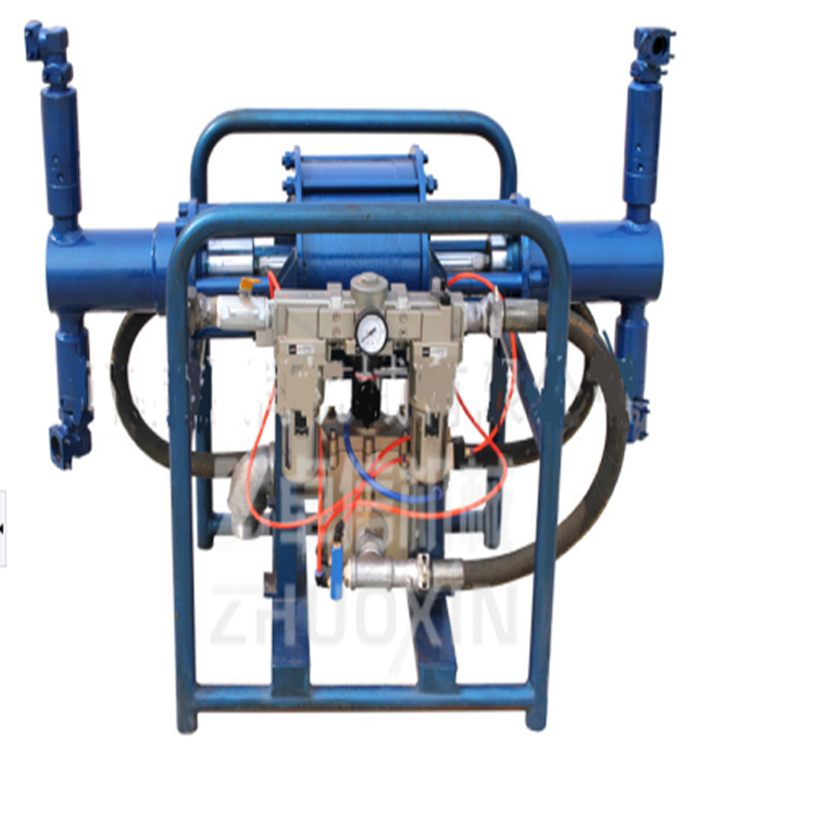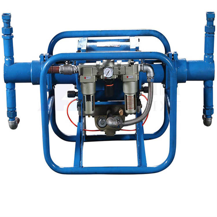 采用氣壓傳動,具有體積小、重量輕的特點,注漿壓力與流量成反比的軟特性注漿液輸送功能,工作效率高。淺層注漿時,能有效地起到保護巖層結(jié)構(gòu)不變的作用?蛇M行漿比為1:1的雙液注漿,更換不同直徑的柱塞,能實現(xiàn)其他比例的雙液注漿。