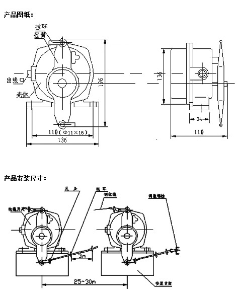 開(kāi)關(guān)間最大距離:40米(水平)、30米(傾斜)、每3米鋼絲繩有一托環(huán)支撐。
