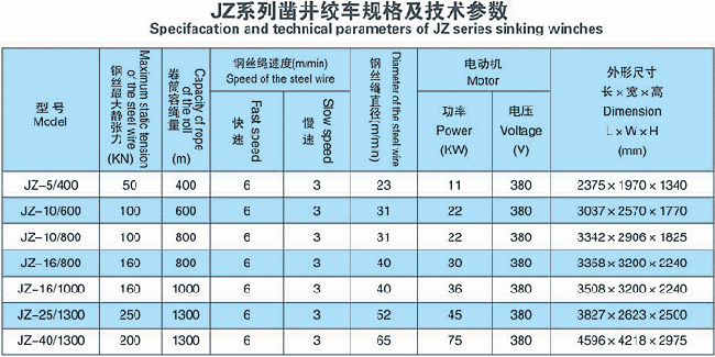 鑿井絞車一般常用的是5T或者10T的,10T鑿井絞車的鋼絲繩最大靜張力為50KN,卷筒容繩量為400M,鋼絲繩速度有快速6M/min,有慢速3M/min,鋼絲繩直徑為23mm,電機功率為11千瓦,電壓為380伏,10T鑿井絞車的鋼絲繩最大靜張力為100KN,卷筒容繩量為600或800,鋼絲繩速度有快速6M/min,有慢速3M/min,電機功率為22千瓦,電壓為380伏